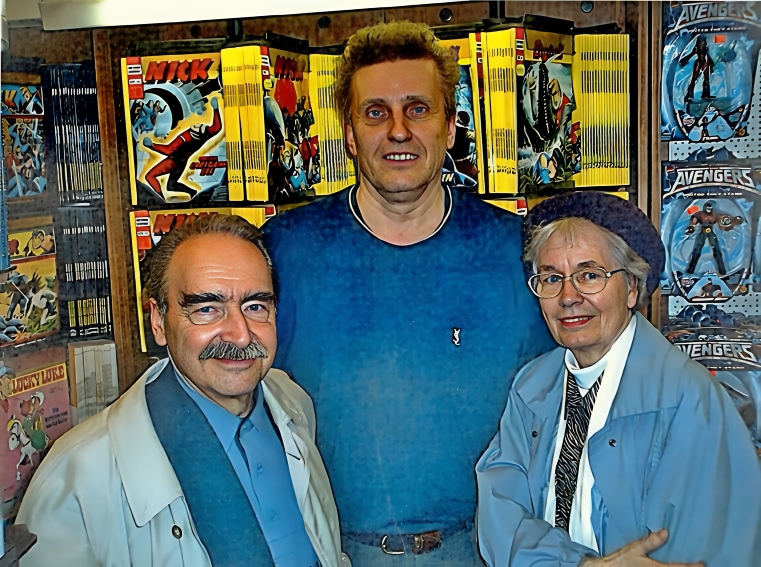 Wäscher-FaszinationDonnerstag, 17. Mai 2001: Mit großer Ungeduld wurde das Berliner Comic-Ereignis des Jahres herbeigesehnt. Die Spannung steigerte sich von Tag zu Tag – die Vorfreude auf Hansrudi war immens. Endlich, nach 21 Jahren kommt der Comic-Vater, der u.a. die Helden „Sigurd“, „Akim“ und „Nick“ erschuf, wieder einmal nach Berlin. Seine Fan-Gemeinde in der Hauptstadt wollte es zunächst gar nicht glauben. Der INCOS-Vorstand musste mehrfach bestätigen, dass diese Info keine ‚Ente’ ist. Zwei Tage vor dem Wäscher-Besuch herrschte in der Roman-Boutique (RB) hektische Betriebsamkeit. Es bedurfte doch einiger Vorbereitungen, damit man der Signieraktion gelassen entgegensehen konnte. Die Berliner Comic-Szene fieberte – das Warten auf Hansrudi Wäscher (HW) war für viele unerträglich. Am Morgen des 17. Mai 2001 verspürte auch ich ein leichtes Kribbeln im Bauch. War es Aufregung oder Freude? Beides würde ich sagen. Wenn alles nach Plan verläuft, wird HW zwischen 15 und 16 Uhr in der RB eintreffen. Es ist jetzt 09.00 Uhr – also noch ausreichend Zeit sich auf das Comic-Ereignis einzustimmen. Gegen 13.30 Uhr habe ich die RB betreten. Und siehe da, es waren schon einige INCOS- Mitglieder vor Ort. Allen voran die Szene Whatcher-Eminenz „Joscha“, wie immer in umtriebiger Unruhe. Warum bloß? Kurz vor 15.00 Uhr machten sich Peter Skodzik und Joscha per Auto auf den Weg, um HW und seine Frau Helga vom Hotel abzuholen. In der RB treffen nun nach und nach viele der Berliner INCOS-Mitglieder ein. Die Wartezeit ist doch für den einen oder anderen eine harte Geduldsprobe. Immer wieder wandert ein Blick zur Ladentür. Wo bleibt der „Meister“? Für viele der Anwesenden wird es das erste persönliche Zusammentreffen mit ihrem „Zeichner-Idol“ sein. Der Camcorder und der Fotoapparat wird noch einmal auf seine Funktionstüchtigkeit überprüft. Hansrudi, herzlich willkommen in Berlin